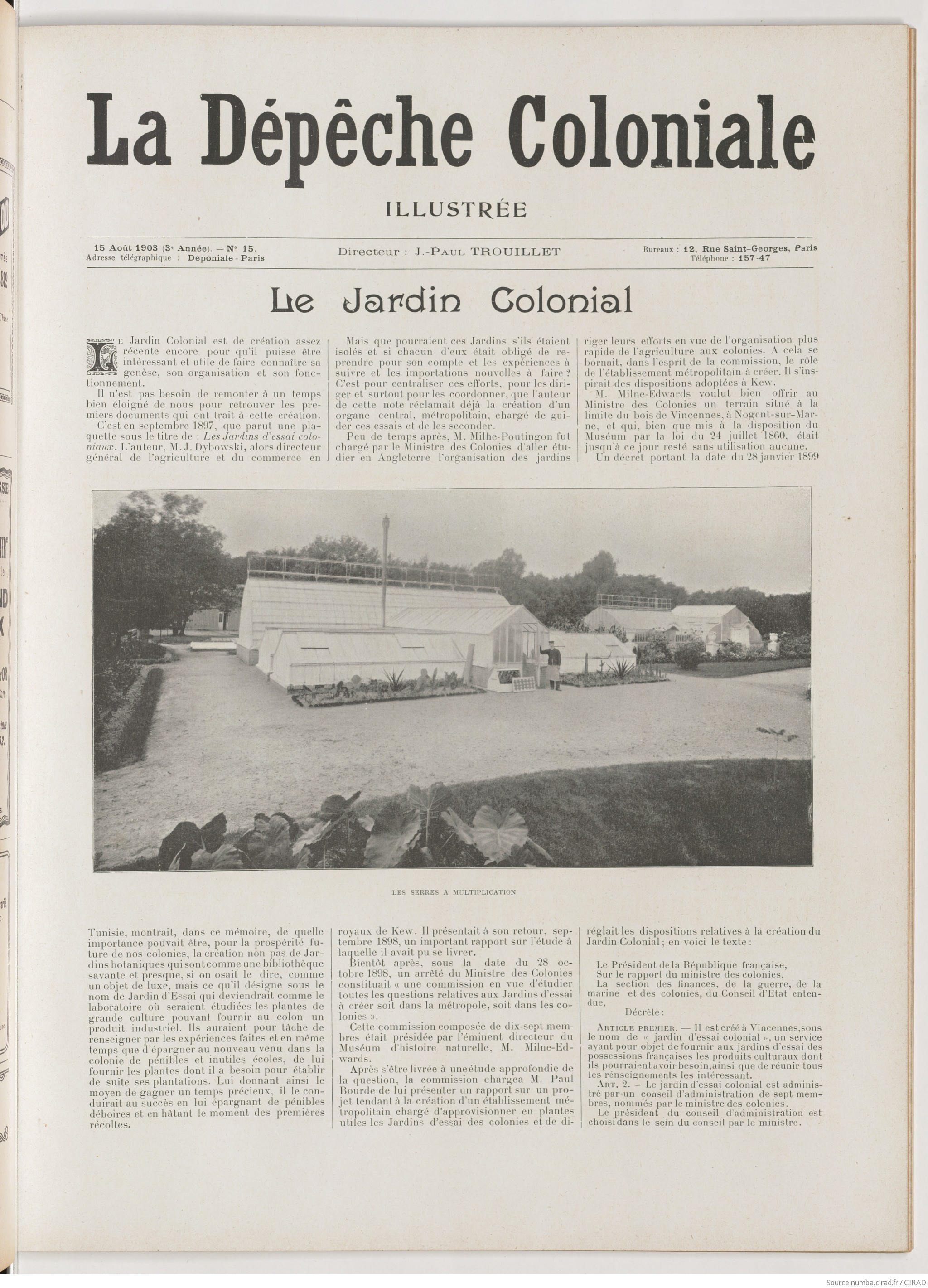 ...un numéro de La Dépêche coloniale illustrée sur l'Exposition nationale d'agriculture coloniale au jardin colonial de Nogent-sur-Marne. Le 15 août 1905, il présentait de façon très complète l'Exposition, la première du genre en France qui y fut organisée cette année-là. Quatre numéros se consacrent entièrement au Jardin en 1903, 1905, 1907 et 1909.